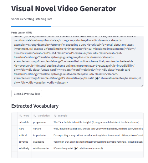 L'Analisi (Il Parsing): Lo script legge il file grezzo della lezione. Identifica le diverse sezioni: il titolo, la spiegazione grammaticale e, soprattutto, i dialoghi.