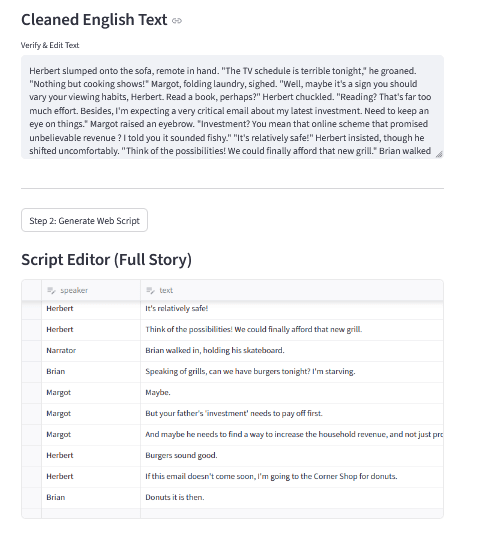 Il Casting Vocale: Qui avviene la magia. Il sistema riconosce i personaggi nel testo. Se nel dialogo parla "Herbert", il sistema assegna automaticamente una voce maschile profonda. Se parla "Margot", assegna una voce femminile specifica. Non c'è una voce robotica uguale per tutti: ogni personaggio ha la sua identità sonora generata da motori TTS (Text-to-Speech) neurali.